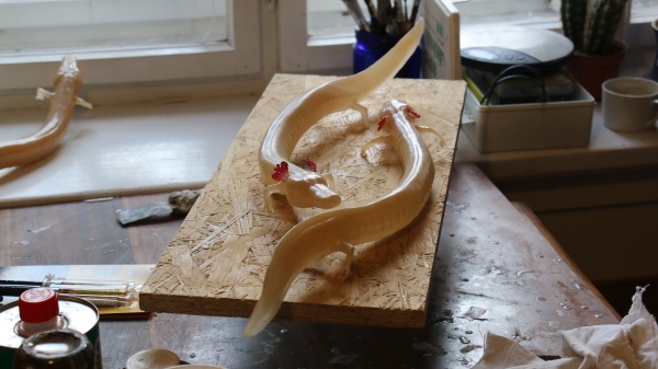 Potom už tvorba pokračovala jako klasická sochařská práce. Výtvarník vytvořil hliněný model, na kterém pomocí silikonu vyrobil formu, do které pak odléval finální model. Pro maceráty dokonce musel vytvořit speciální hmotu, která by co nejvíce odpovídala reálnému vzhledu těchto zvířat.