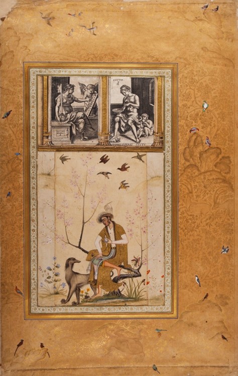 The second miniature (A12183) depicts a young nobleman sitting on the branch of a low tree with a greyhound by his feet. In both Indian miniatures, above the central scene are two European copperplate engravings, creating a remarkable collage. The Emperor Jahangir collected these European prints. These probably came to India with the Jesuit missionaries.