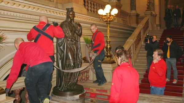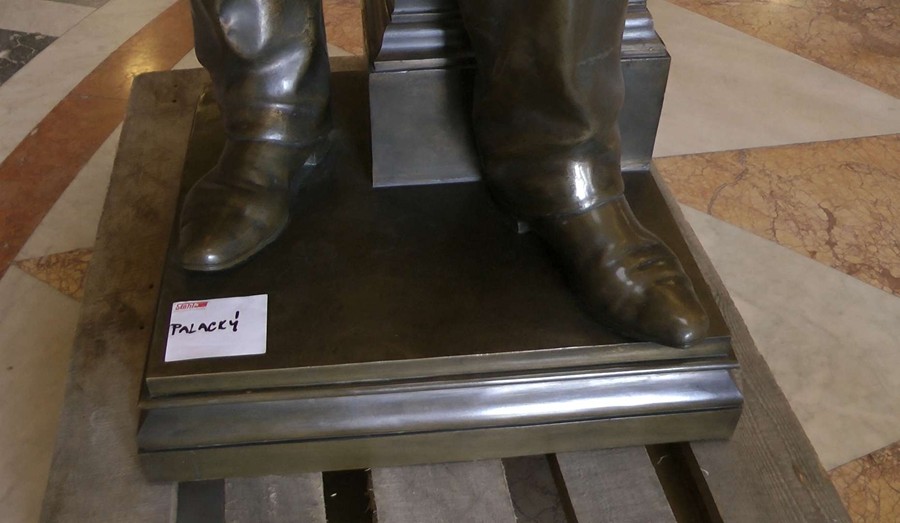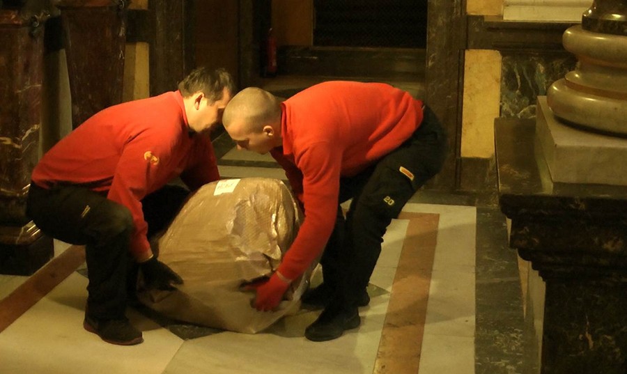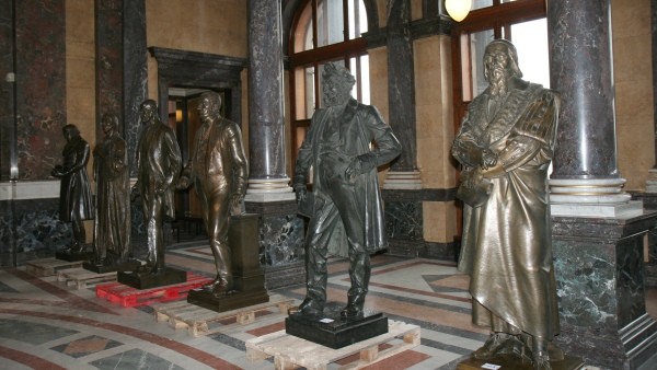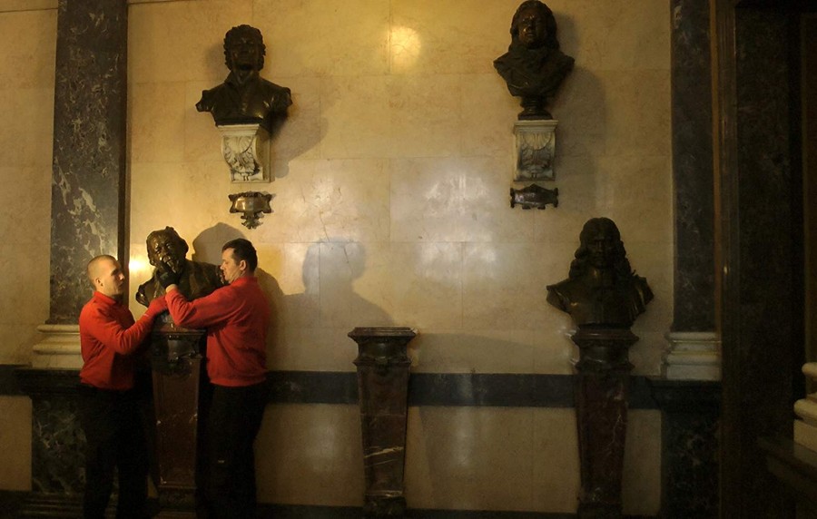 Sochy, sejmuté ze soklů, čekají v Pantheonu na transport.