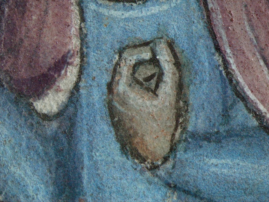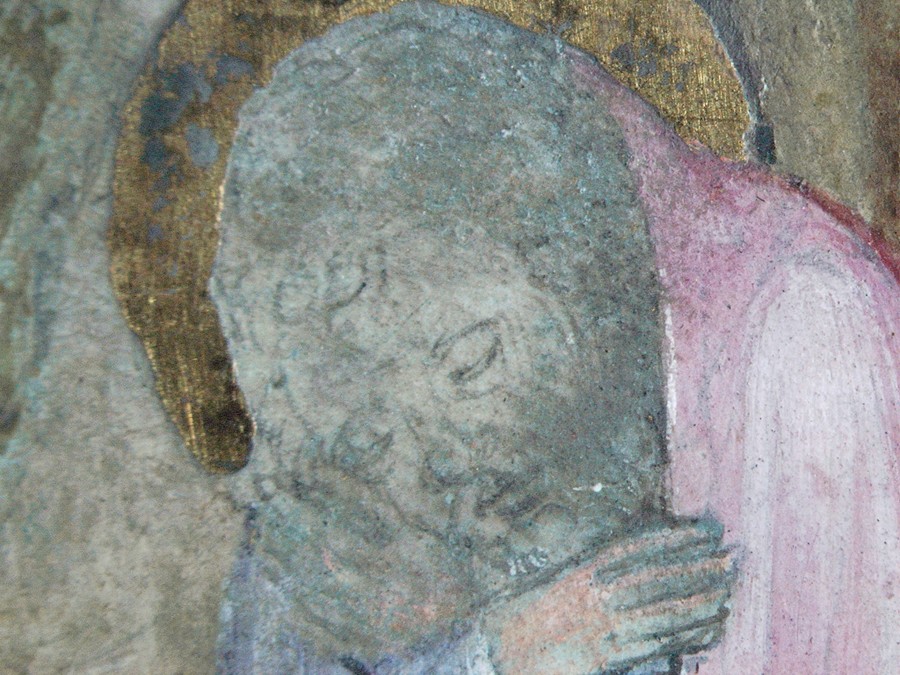 Josef z iluminace „Narození Krista“ v iniciále P, detail znehodnocené malby obličeje s patrnými obrysy v podkresbě