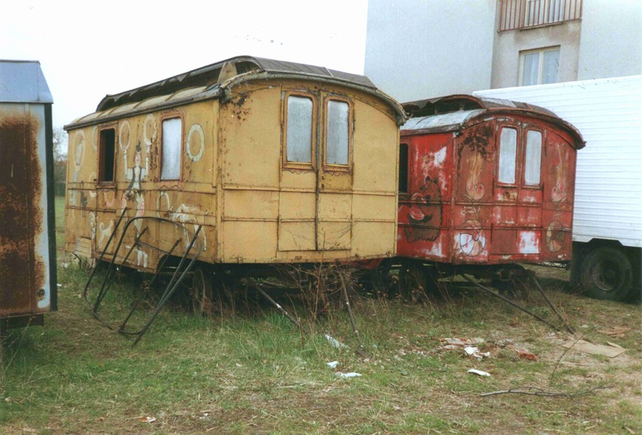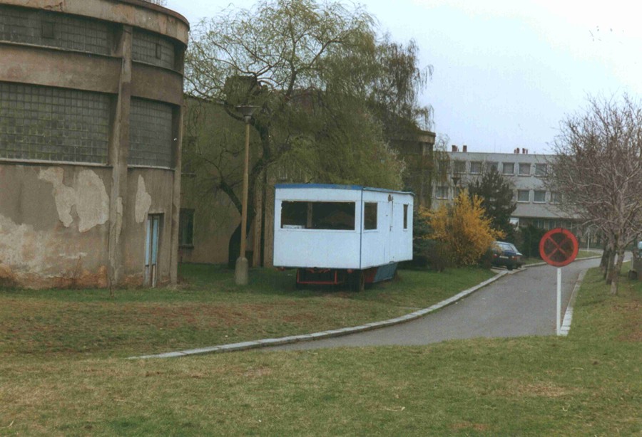 Netypicky přestavěná maringotka (s prosklenou polovinou kabiny) před administrativním blokem u koňské manéže, fotografie z roku 1992