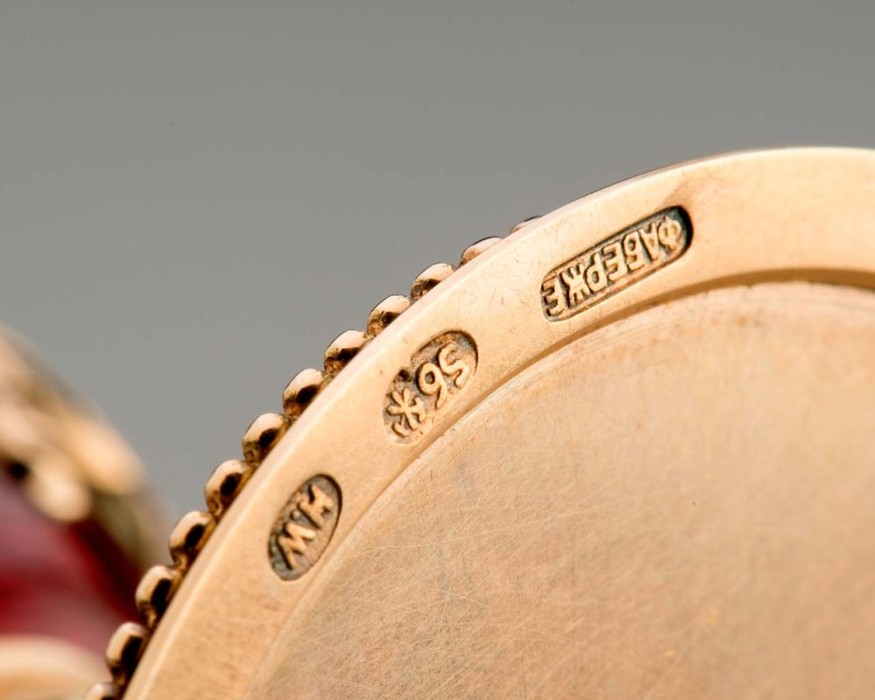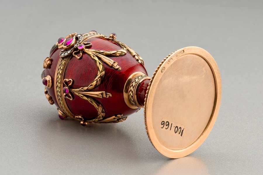 Pravděpodobně novodobá kopie Fabergého vejce - detail se značkou Fabergé v azbuce