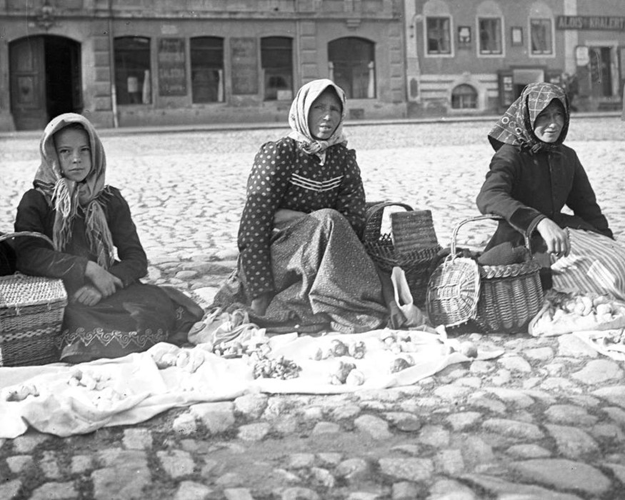 Sběr lesních plodů nebyl jen zdrojem potravy, ale i možností, jak si přivydělat. Prodavačky hub v Třebíči r. 1907