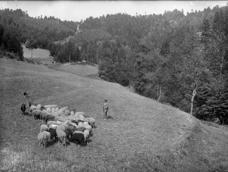 Stádo ovcí a koz pasoucích se na strnisku v Kubíčkových potůčkách u Nového Hrozenkova. Září 1927
