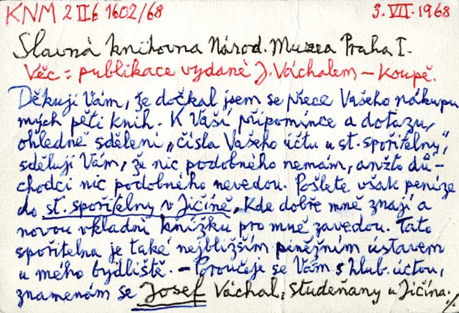 Dopis Josefa Váchala z 3. července 1968, ve kterém vyjadřuje poděkování za nákup jeho pěti autorských knih do sbírek Knihovny Národního muzea, a sděluje, kam mají být peníze z prodeje knih zaslány.