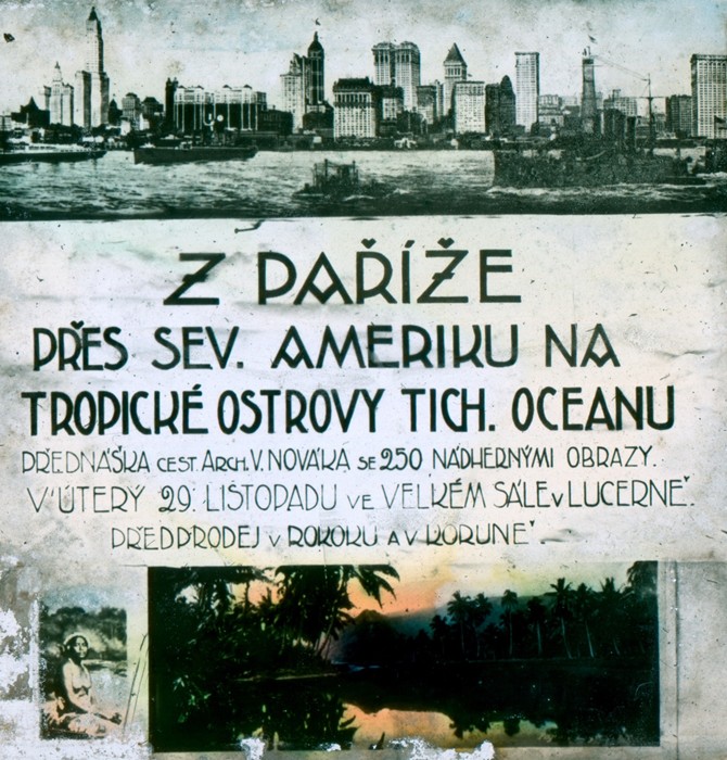 Reklamní diapozitiv, inzerující Novákovu přednášku "Z Paříže přes Sev. Ameriku na tropické ostrovy Tich. oceánu", která se konala v úterý 29. listopadu 1921 ve velkém sále pražské Lucerny (zdroj: Národní muzeum)