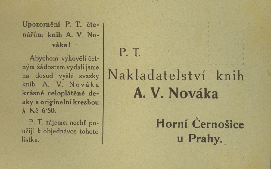 Reklamní korespondenční lístek Nakladatelství knih A. V. Nováka. (zdroj: Národní muzeum)