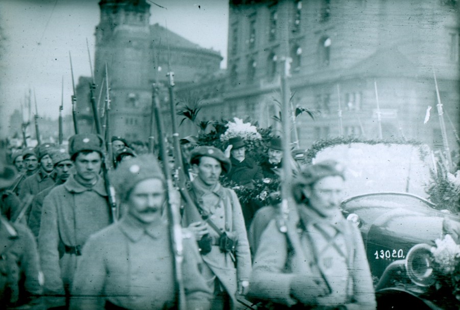 Příjezd T. G. Masaryka do Prahy. Jeden z diapozitivů, které A. V. Novák promítal krajanům v USA. (zdroj: Národní muzeum)