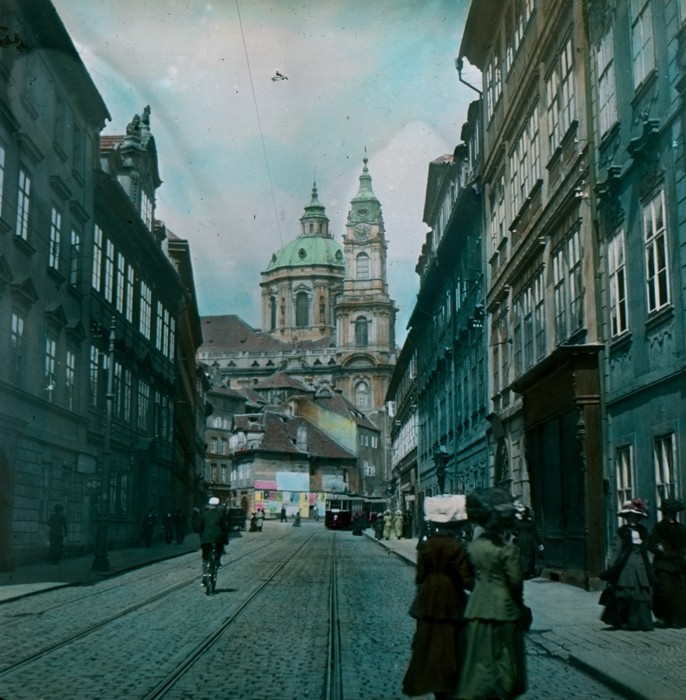 Karmelitská ulice v Praze. Jeden z diapozitivů, které A. V. Novák promítal krajanům v USA. (zdroj: Národní muzeum)