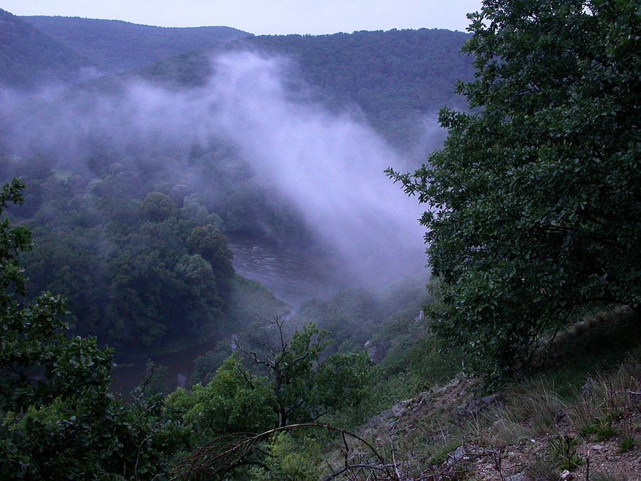 Časté mlhy nad údolím Dyje způsobují inverzi, která v NP Podyjí umožňuje přežívání mnohým chladnomilným druhům hmyzu. Na snímku Šobes v pozdně večerním hávu, červenec 2009.