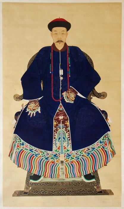 Posmrtný portrét muže v dračím rouchu Malba na hedvábí Čína, konec dynastie Čching (1644–1911)
