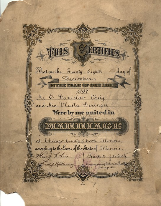 Oddací list Vlasty Geringerové a Enrique Stanko Vráze z roku 1897