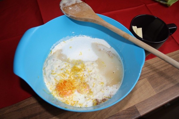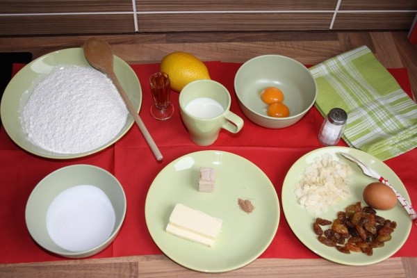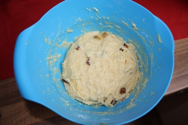 Až kvásek nakyne, přidáme zbylý cukr, vanilkový cukr, zbytek mléka, rum, špetku soli, muškátový oříšek, citrónovou kůru a 4 žloutky. Jakmile se nám suroviny spojí, přidáme nakonec ještě rozehřáté máslo a rozinky.