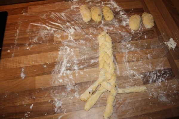 Nejdříve upleteme cop ze 4 pramenů, dáme jej na plech a hřbetem ruky uděláme uprostřed prohlubeň. Následuje stejný postup u dalšího copu, který bude jen ze tří pramenů, a nakonec přidáme cop ze dvou pramenů, jehož konce podhrneme pod vánočku.