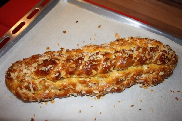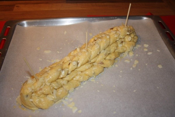 Vánočku necháme na plechu ještě asi 15 až 20 minut kynout. Pak ji potřeme rozšlehaným vejcem a posypeme mandlemi. Aby se nám prameny nesvezly, můžeme vánočku propíchat na několika místech špejlemi.