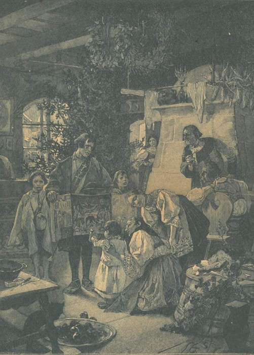 Oblíbení byli také koledníci dráteníci ze Slovenska, kteří chodili s přenosným betlémem o chalupách na Slovácku a za výslužku předváděli příběh narození Ježíška. Ilustrace Alfonse Muchy pro knihu Veselé chvíle v životě lidu českého.