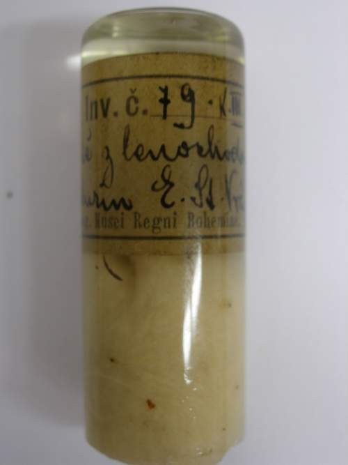 Epruveta (malá skleněná nádobka s rovným dnem, uzavřená smotkem vaty) s klíštětem