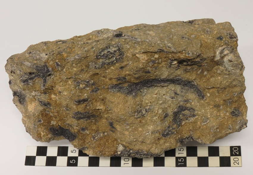 Suevit z bavorského kráteru Ries se skládá ze světlých úlomků vápenců a tmavého přírodního skla. (foto: Vladimír Šrein).