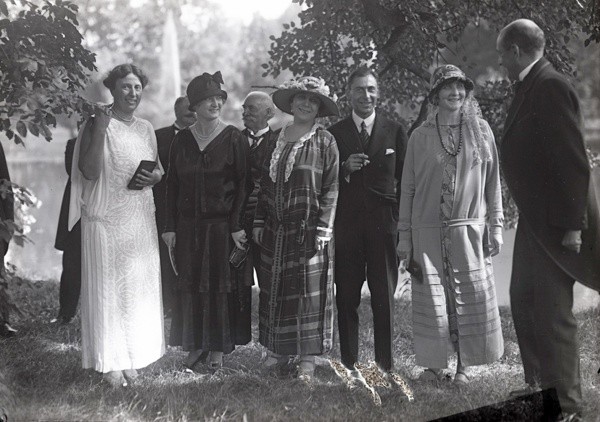 Alice Masaryková (první z leva) v róbě s vyšitými schématickými rostlinnými motivy u příležitosti zájezdu diplomatů Malé Dohody do Lán, 1924.