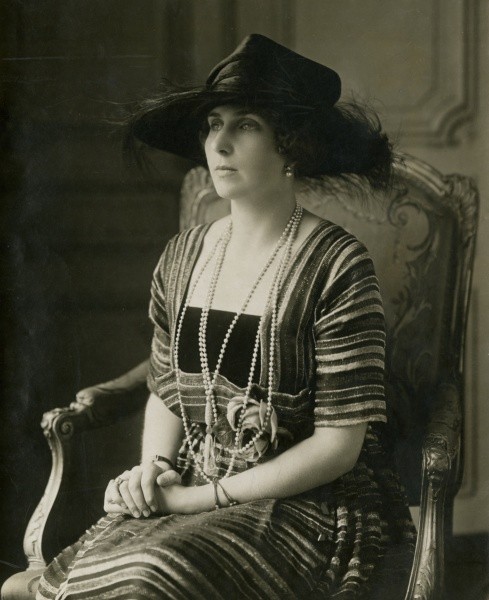 Belgická královna vdova Alžběta v šatech zdobených textilní broží, 1930.
