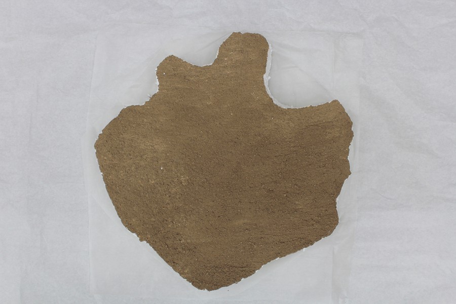 Pohled na dílo z rubové strany. Pod okrovou barvou se skrývá polystyrenová adjustace