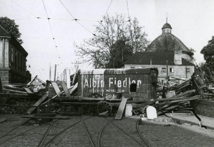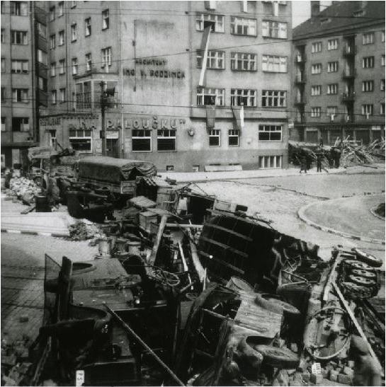 Celkový pohled na barikádu u Olšanských hřbitovů. 6. 5. 1945