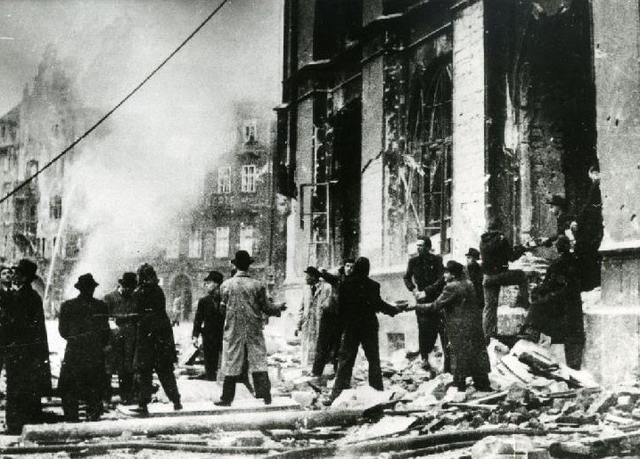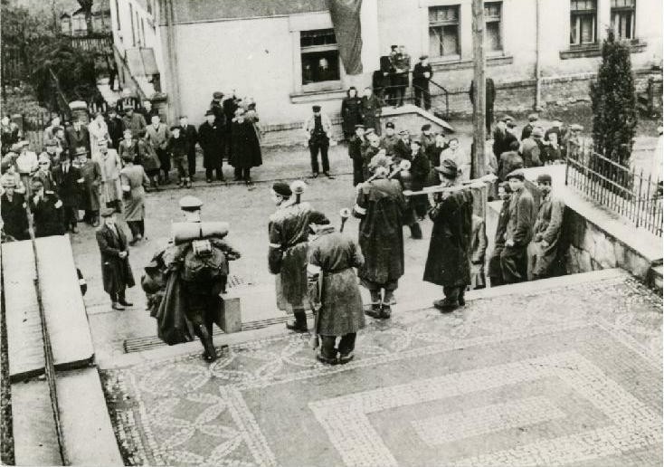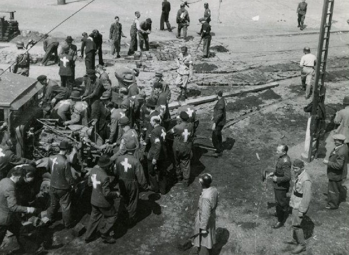 Zajatí němečtí vojáci i civilisté se museli po ukončení povstání podílet na likvidaci barikád a úklidu válečných škod v Praze. 9. 5. 1945