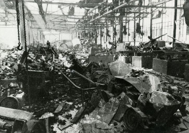 Rozbombardovaná montážní hala automobilky ASAP v Mladé Boleslavi po náletu 10. května