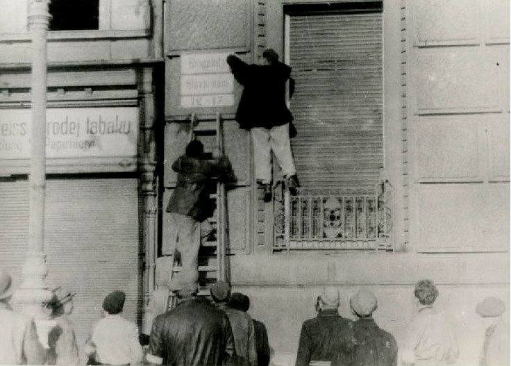 Odstraňování německých nápisů v Praze. 4. 5. 1945