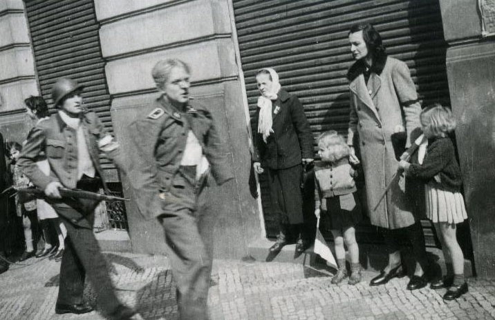 Zajatý německý voják míjí vdovu se dvěma dětmi. Foto Jiří Janovský 5. 5. 1945