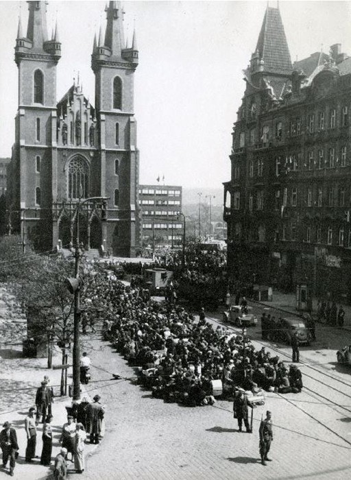 Německé obyvatelstvo shromážděné po osvobození Prahy na Strossmayerově náměstí. 10. 5. 1945