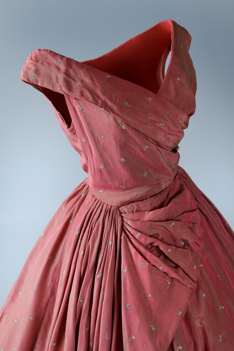 Šaty dívčí společenské růžové s drobnou strojovou výšivkou, šantungové hedvábí s šanžánovým efektem, Salon Eva – dříve Hanna Podolská, 1957–1959.