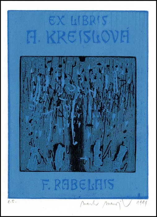 Strom z ostrova Železov. Motiv z knihy F. Rabelaise Gargantua a Pantagruel. Exlibris z roku 1994 vytvořené pro A. Kreislovou technikou dřevořezu.