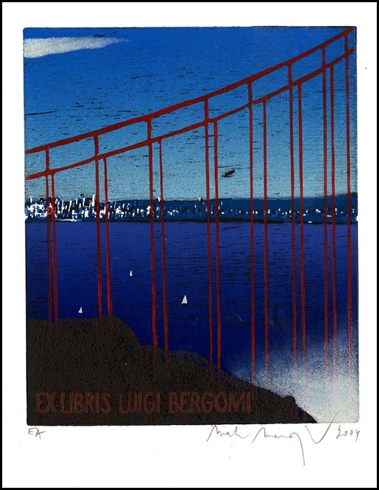 Golden Gate Bridge. Ex libris z roku 2004 vytvořené pro Luigiho Bergomiho technikou dřevořezu a kombinovanou technikou.