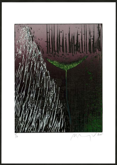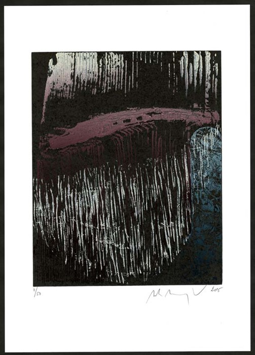 Ukázka grafiky Stáří ze souboru Mládí a Stáří vytvořené v roce 2015 technikou linorytu a otiskem kůry.