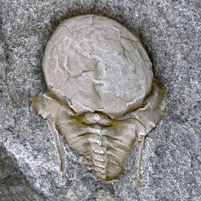Rané vývojové (protaspidní) stádium trilobita druhu Eccaparadoxides pusillus. Jedinec je dlouhý asi 1,2 mm a pochází z kambrických hornin v okolí obce Skryje na Křivoklátsku.