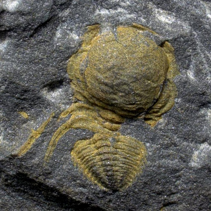 Rané vývojové (protaspidní) stádium trilobita druhu Hydrocephalus carens, které je nápadné nafouklou glabelou (kruhovitý útvar vpředu). Jedinec je dlouhý přes 2 mm a pochází z kambrických hornin v okolí obce Skryje.