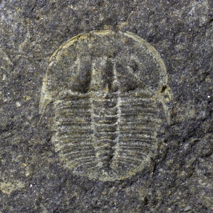 Rané vývojové (meraspidní) stádium trilobita druhu Aulacopleura konincki. Jedinec je dlouhý asi 2,5 mm a pochází ze silurských hornin v okolí obce Loděnice.