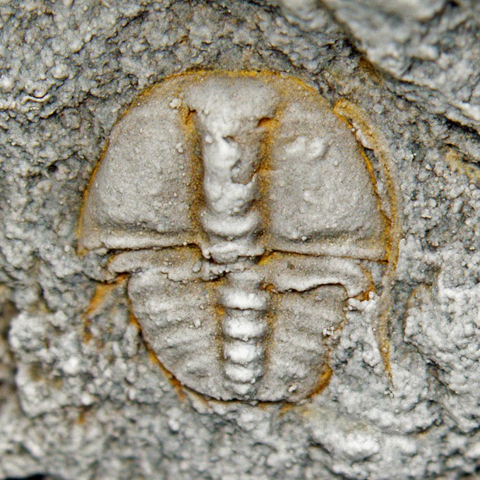 Rané vývojové (meraspidní) stádium trilobita druhu Deanaspis senftenbergi z ordovických hornin poblíž Berouna. Jedinec je dlouhý asi 1,5 mm.