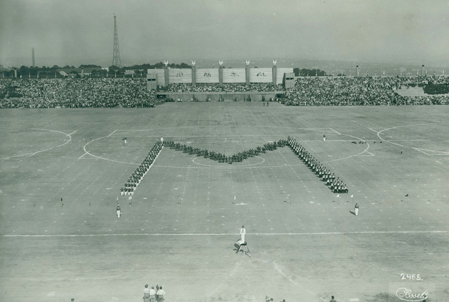 Jihoslované na sletu v roce 1932 vytváří monogram prezidenta Masaryka