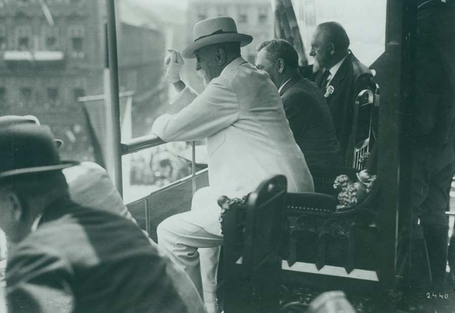 Slet všesokolský v Praze 1920. Prezident Masaryk při cestě ke kladení základního kamene k památníku osvobození na Žižkově