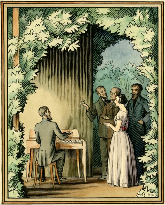 Ilustrace k povídce Figurky. Neruda, Jan: Povídky malostranské. Praha: Fr. Borový, 1927