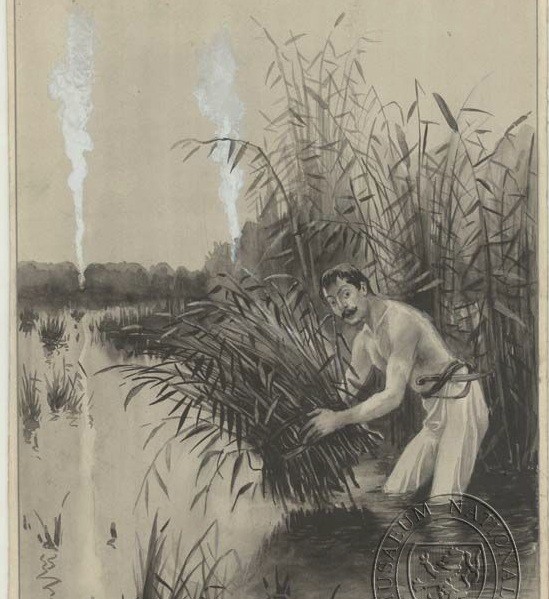 Old Shatterhand s rákosím stojící po kolena ve vodě; May, K.: Old Surehand. Díl I. Praha : J. R. Vilímek, 1902