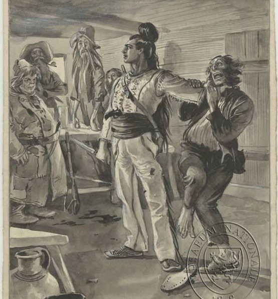 Vinnetou držící muže za krk; May, K.: Old Surehand. Díl II. Praha : J. R. Vilímek, 1902