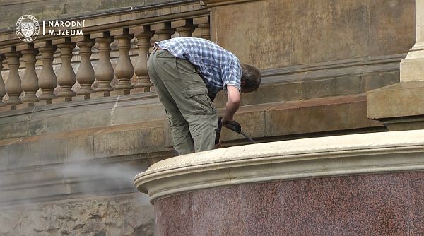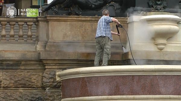 Pracovník údržby čístí fontánu před Národním muzeem.