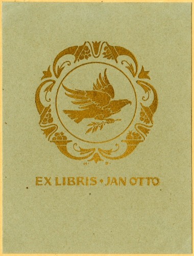 Exlibris od Huga Boettingera pro nakladatele Jana Ottu. Zinkografie z roku 1915.