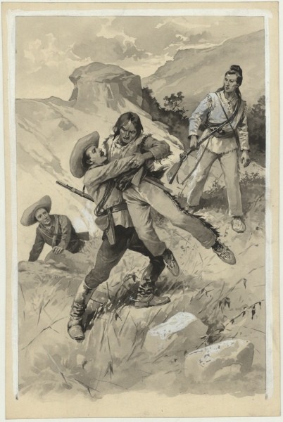 Ilustrace Věnceslava Černého ke knize Karla Maye Satan a Jidáš. Vydal Alois Hynek v roce 1906. Lavírovaná kresba tuší.