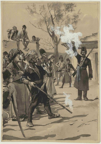 Scéna se zázračnou kulkou. Gustav Krum - ilustrace ke knize Zemí Škipetarů.