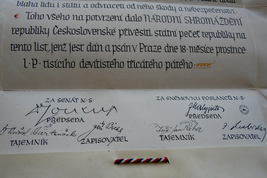 Podpisy na diplomu z roku 1935 (prezident Edvard Beneš)