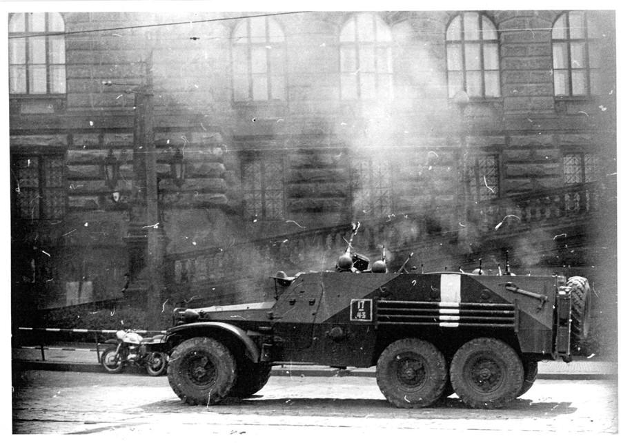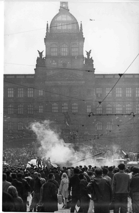 Nepokoje v horní části Václavského náměstí při okupaci Československa 1968. Foto: Kříž